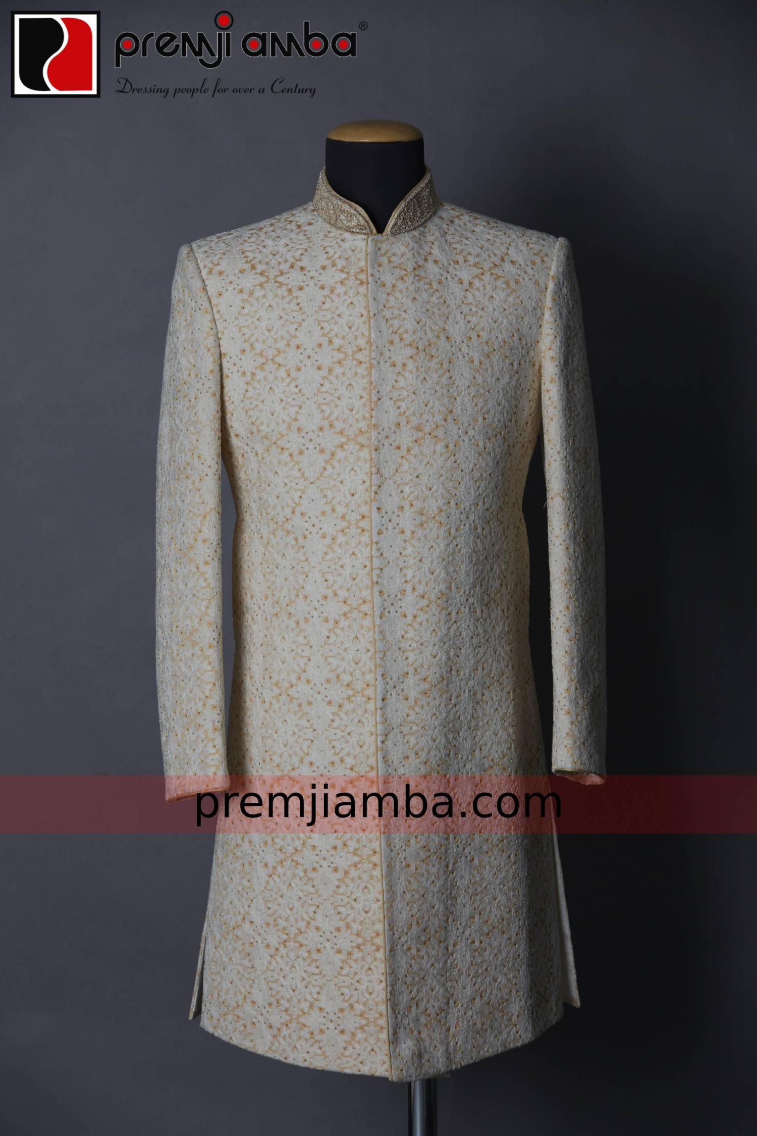 PURE SILK SHERWANI WITH CHIKAN WORK & HAND WORK ON STAND PATTI AND LOWER IS SURWAL GOLD COLOUR.