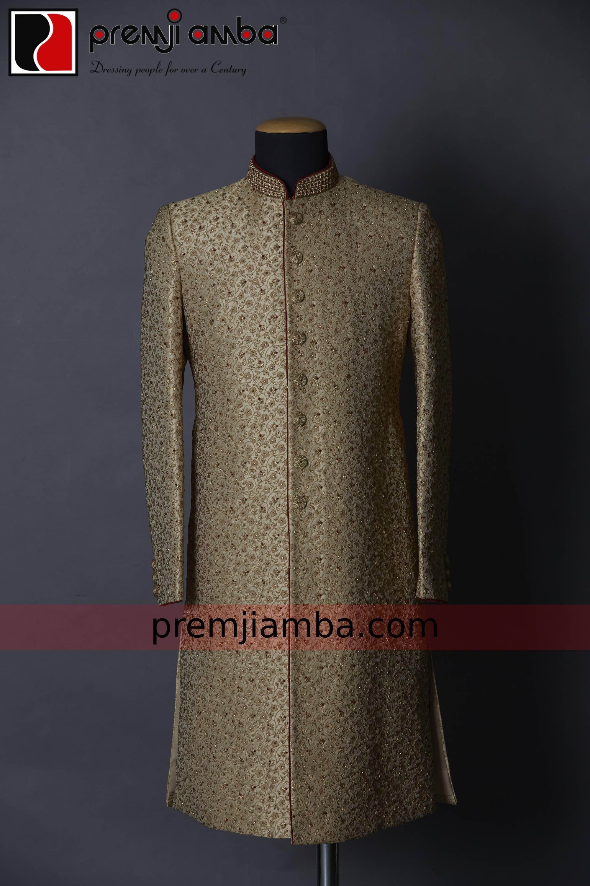 PURE SILK SHERVANI WITH HAND JARDOSHI WORK ON STAND PATTI AND LOWER IS SURVAL MAROON COLOUR.