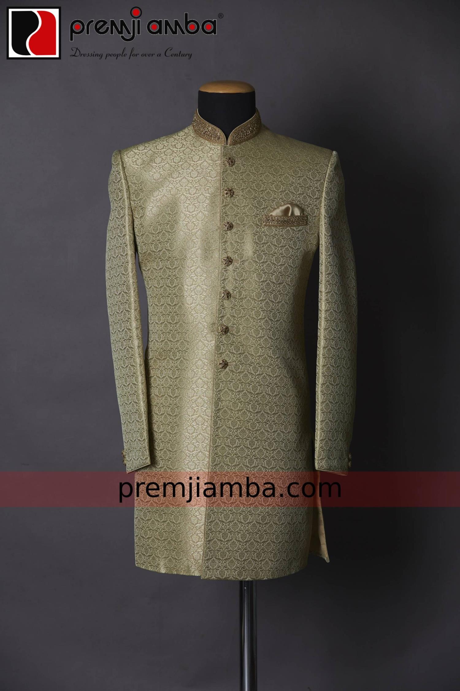 PURE BROCKET SILK INDO WESTERN SHERVANI WITH HAND JARDOSHI WORK ON STAND PATTI AND